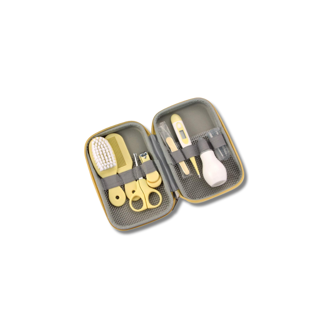 Complete grooming set: nail clippers, scissors, file, brush, comb, nasal tweezers, thermometer case, and storage pouch.